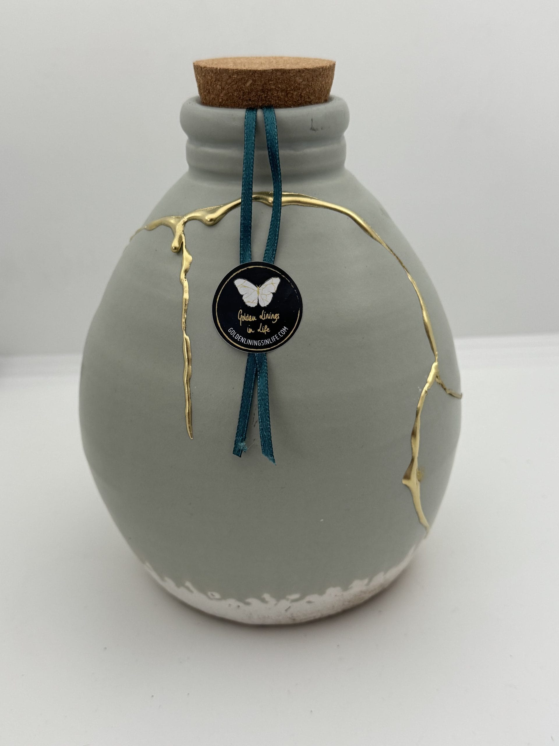 Kintsugi Urn | Lichtgroen Zwaar Keramiek | Handgemaakt Gedenkstuk | Gouden Druppels | Wabi-Sabi Urn met Kurksluiting
